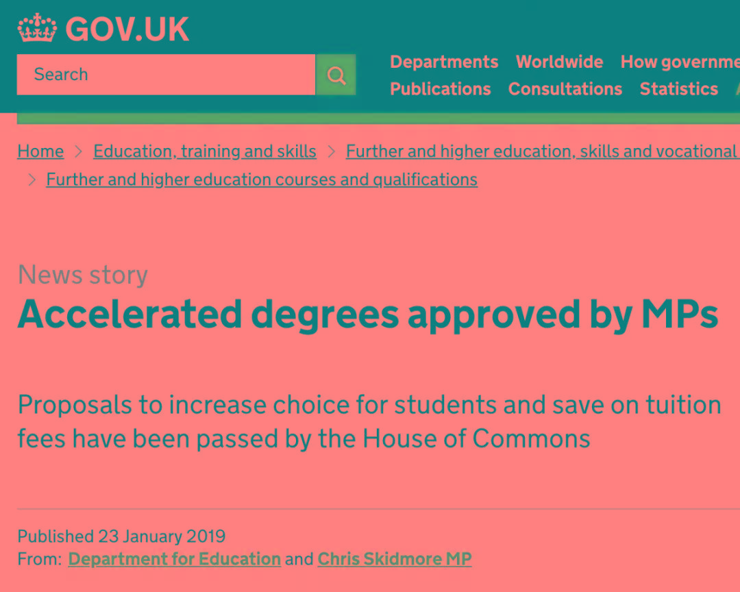近日,英国官方宣布: 2019年9月起,学生可以选择学习两年制「快速学位」,并且每年支付11,000英镑的学费。 早在2018年11月中旬,英国大学事务大臣萨姆·吉玛 (Sam Gyimah) 在讲话中宣布,大学以后可以提供两年制的快速学位(accelerated degrees )。 今年1月,根据英国教育部的提议,英国下议院批准了立法,两年制快速学位即将正式开始实行。 就教学质量而言,快速学位与标准学位的教学质量完全相同,毕业后提供的学位也和标准学位完全一样,但课程将在更短、更密集的时间内完成。